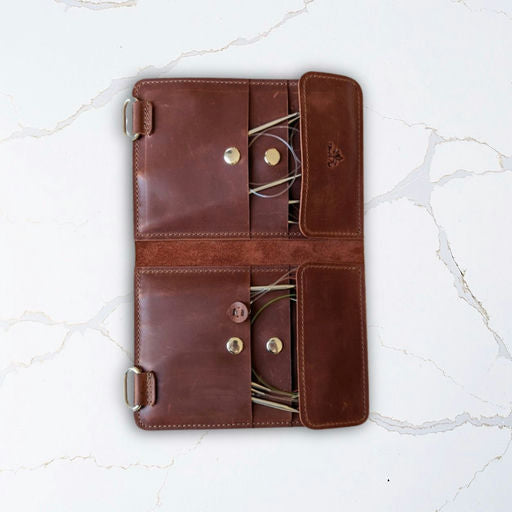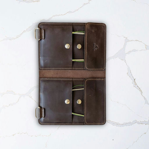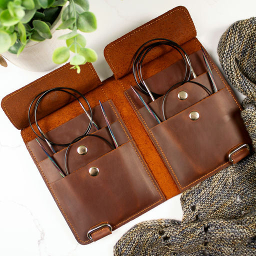 This compact carrying case from Thread and Maple is designed to store up to 12 pairs of fixed circular needles. It has 6 slip pockets, 3 on each side, all secured with a snap or flap to ensure your needles and cables can be neatly tucked away. Slip it into your Needle Binder to keep your fixed circulars together with the rest of your collection, or fold and snap it closed to take on the go as a standalone carrying case.