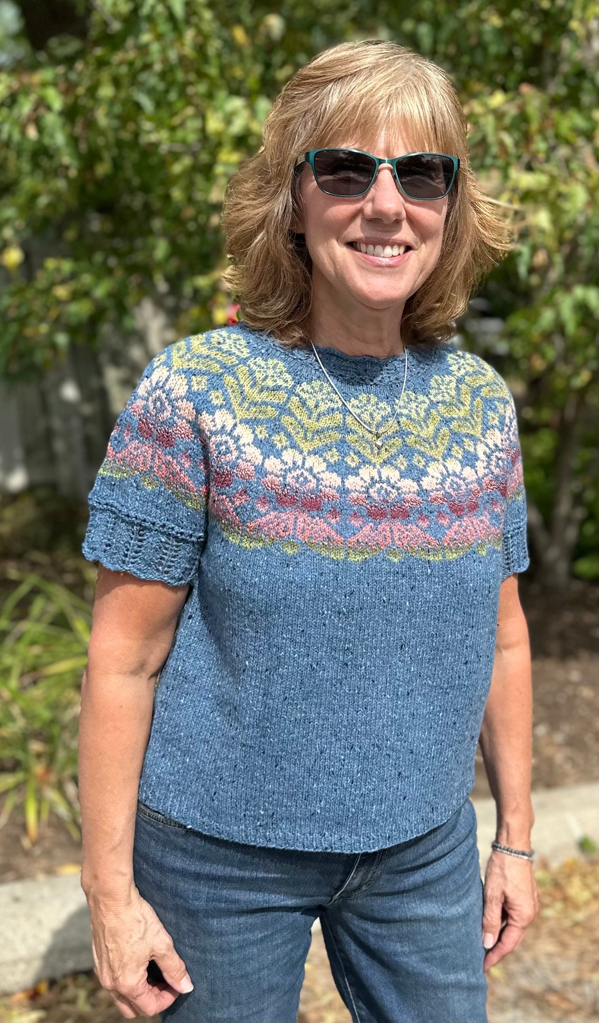 Alpine Bloom is a light summer tee knit from the top down featuring a sweet lace neckline and sleeves and a Scandinavian-inspired floral colorwork yoke. Short rows are worked at the back neck for an improved fit. The sleeves are knitted separately and grafted on. Instructions are given for lengthening the body as desired and for simple ribbed sleeve cuffs if you’d prefer not to graft the sleeves on.