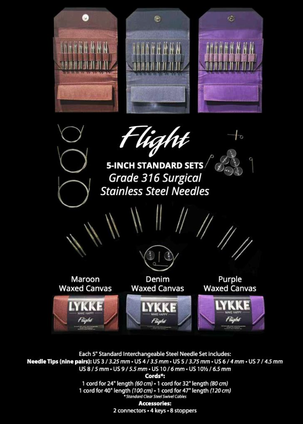 individual gift set of 9 pairs of 316 grade stainless steel interchangeable needles -- (US sizes 3, 4, 5, 6, 7, 8, 9, 10, 10.5) -- 4 clear standard size steel swivel cords (24", 32", 40", 47") -- (2x) connectors - (4x) keys - (8x) stoppers