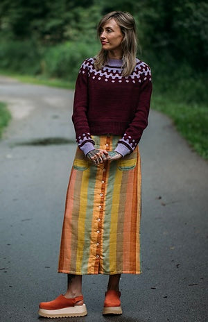 Our 2025 Rhinebeck sweater! The inspiration for this sweater began with a beautiful modern rug with undulating curves. I immediately began drawing up some colorwork charts, and love the organic, bold shape of this yoke. After knitting thru the first chart, I was inspired to add some perfectly round polka dots, and the jammy colors and drippy motif just had me thinking “ooey gooey” as I was knitting! This sweater is worked from the top down, seamlessly. The sleeve stitches are put on hold while the body is finished and then returned to the needle.